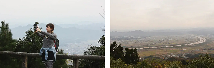 山頂から10分ほど歩くと、展望台として使われている広場があります。ここからは、出雲平野を一望できます。まるで天から天照大御神オオミカミが見下ろしているような気分で、ヤマタノオロチ伝説で8つの頭を持つ蛇に象徴される斐伊川から、国引き神話に登場する遠くの園の長浜の海岸、さらには三瓶山まで見渡せました。ハイキングで疲れていましたが、美しい景色が私たちに元気を与えてくれ、下山の力になりました。