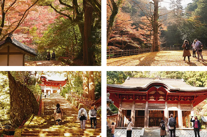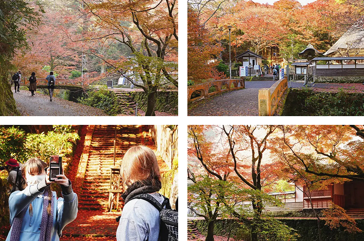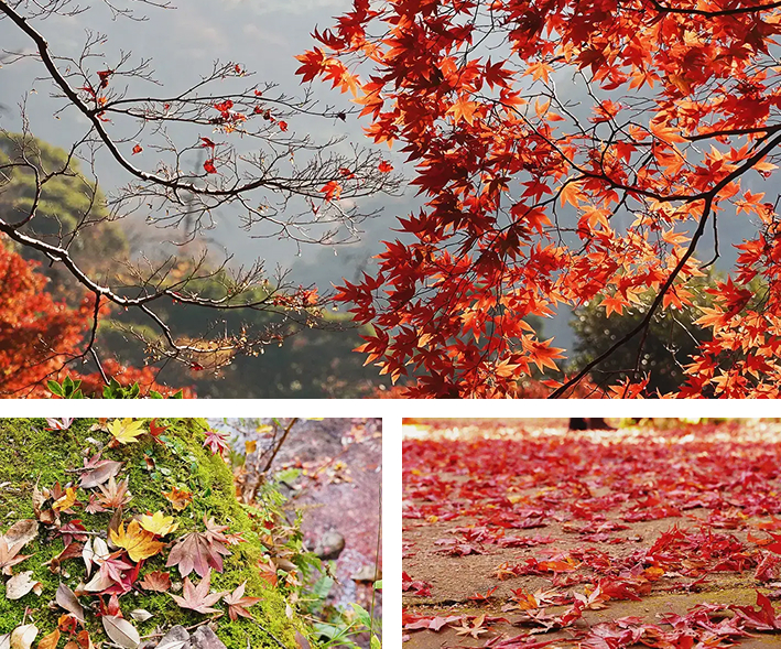 鰐淵寺の紅葉はとても鮮やかで美しく、地域で最高と称されています。境内に植えられている木々は、一般に「イロハモミジ」として知られる日本のカエデの一種です。赤やオレンジ、黄色に染まった葉が幾重にも重なり、山全体を彩ります。この壮麗な光景は、言葉では表しきれません。