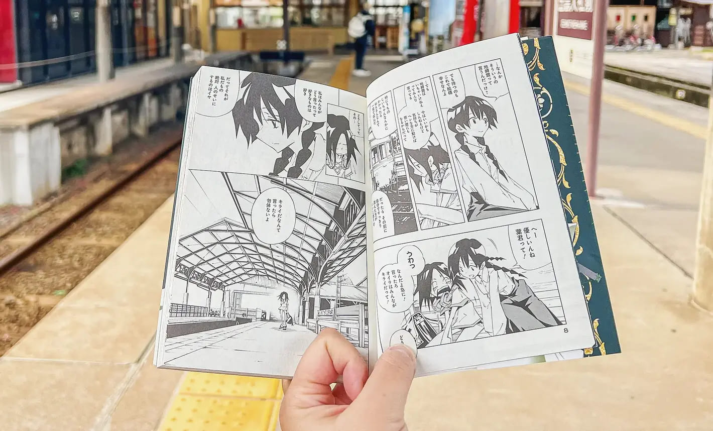 まず、シャーマンキングのシーンを探しに駅に入りました。そして、ついに見つけました!ホームのベンチで、もうすぐ発車する電車を背景にそのシーンを再現して写真を撮りました。今まで漫画の中でしか見たことがなかったものを自分の目で見ることができて、とても感動しました。