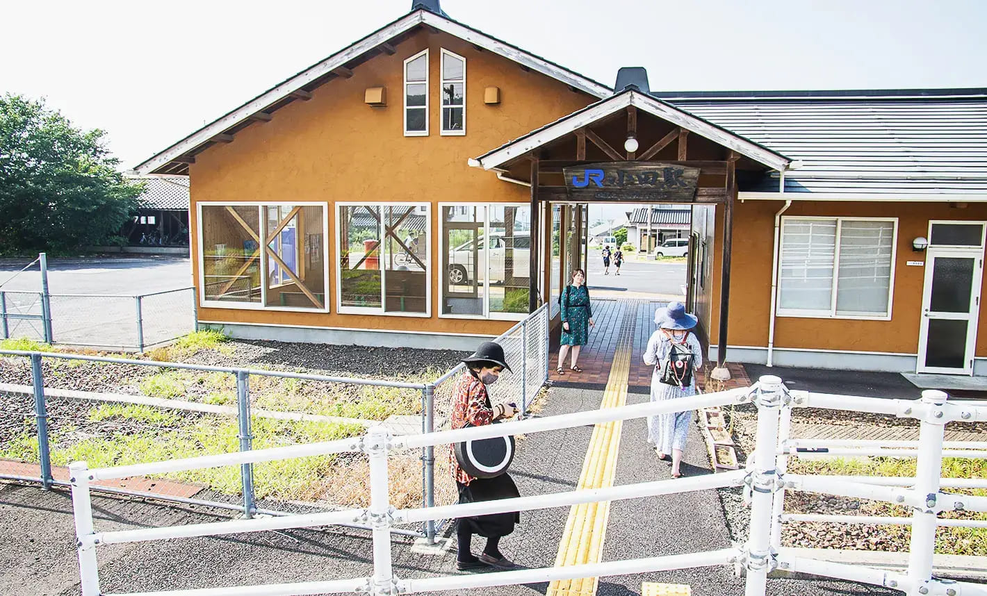 昼食の後、私たちは出雲市駅へ向かい、西出雲行きの電車に乗りました。乗車時間はわずか5分ですが、あっという間に過ぎてしまいます。その間に、鮮やかな緑の田んぼで農家の方が作業する様子や、夏休み中の子どもたちが自転車に乗っている風景を楽しむことができます。ここでの目的地は、植物園「花の郷」です。
