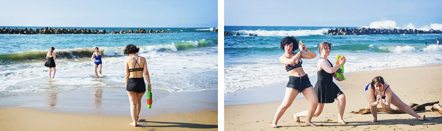 ビーチでは、リラックスしたり日焼けを楽しんだりするために、パラソルやビーチ用品をレンタルできます。でも、私たちは遊びに来ました。水はちょうどいい温度で、涼むのにぴったりでしたし、水鉄砲に水を入れてお互いに撃ち合うのにも最適でした(他のビーチの人には当たらないように注意しました)。波に飛び込んだり、水鉄砲を持ってポーズを取ったり、ターニャは少し泳いだりしました。