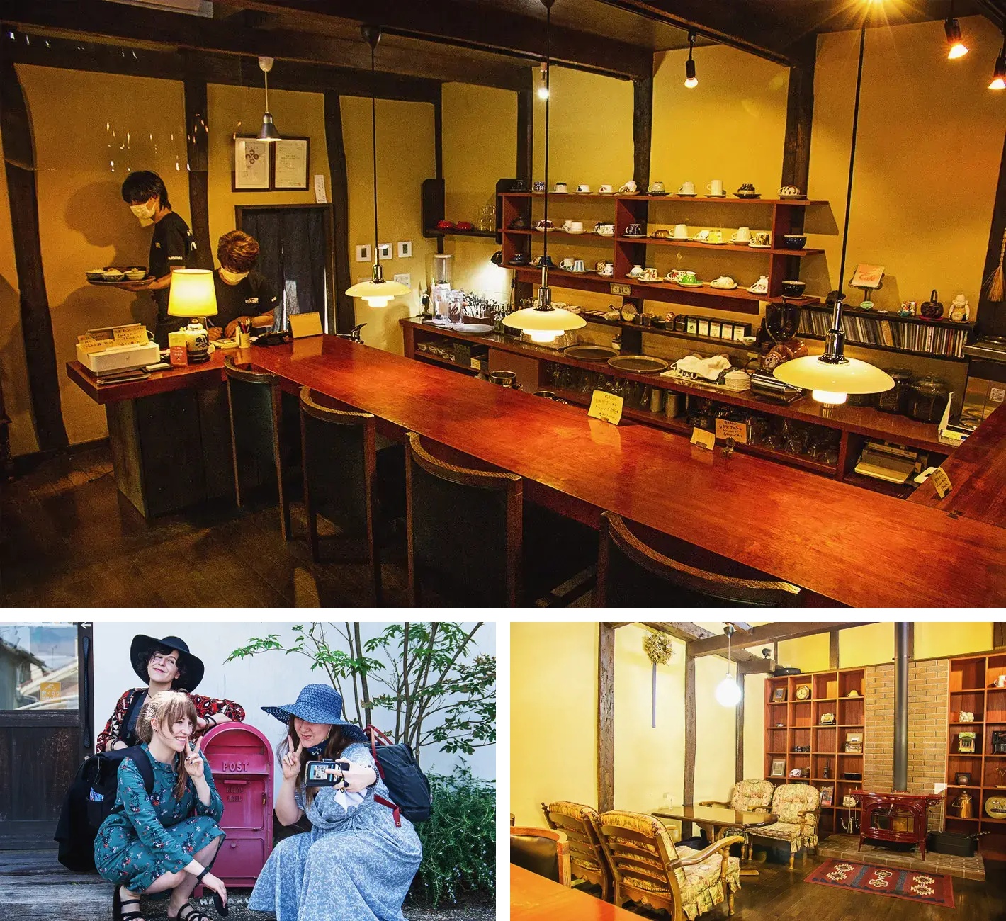 心地よい涼しさのカフェに入ると、私たちは黄色い花が咲く生け垣を眺められる窓際のテーブルを選びました。壁には本や雑誌がぎっしりと並び、アンティークカメラやさまざまな小物がセンスよく飾られています。さらに奥へ進むと、カウンター席と、店内に点在するふかふかの緑の椅子がある部屋があります。カウンター席を選べば、カフェのティーカップやコーヒーセットのコレクションが並ぶ壁を眺めることができます。