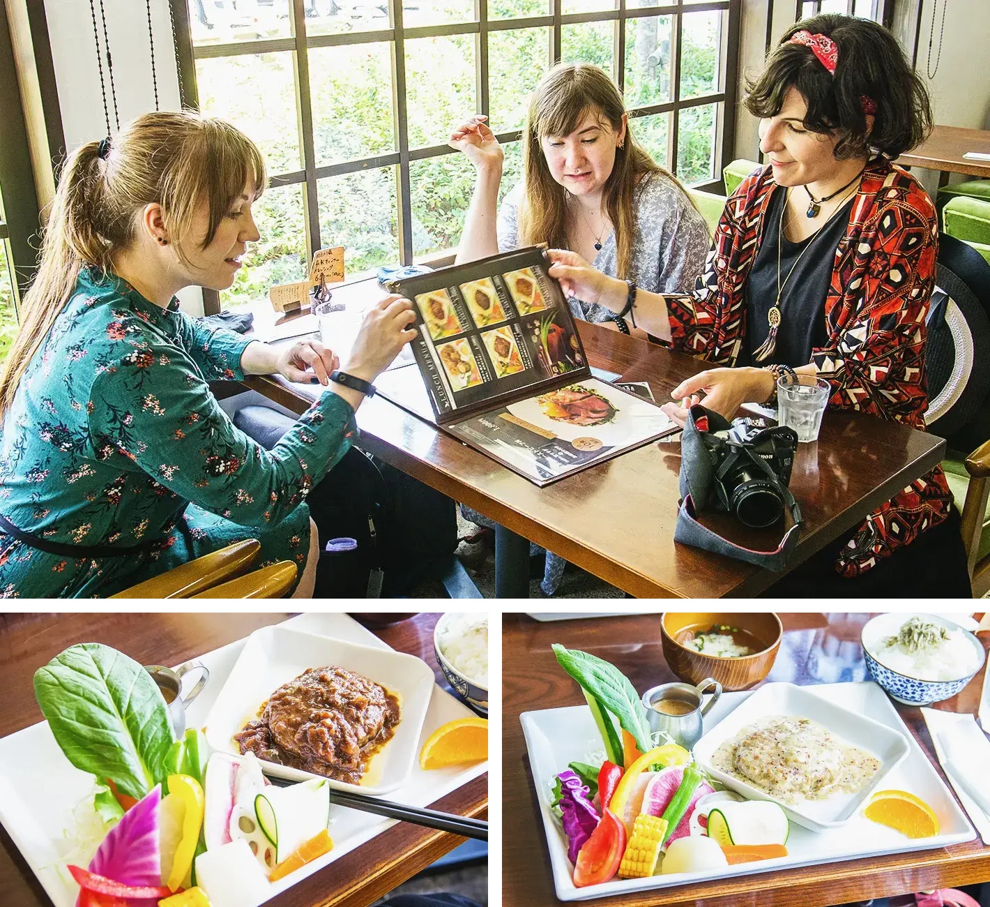 私たちは全員、ハンバーグランチセットを選びました。カミラは味噌、タンヤはガーリック、ジルはマスタードソースです。セットには味噌汁、昆布の佃煮がのったご飯、サラダが付いてきます。このお店はふわふわのシフォンケーキと、どの食事にも付いてくる美しいサラダで有名です。