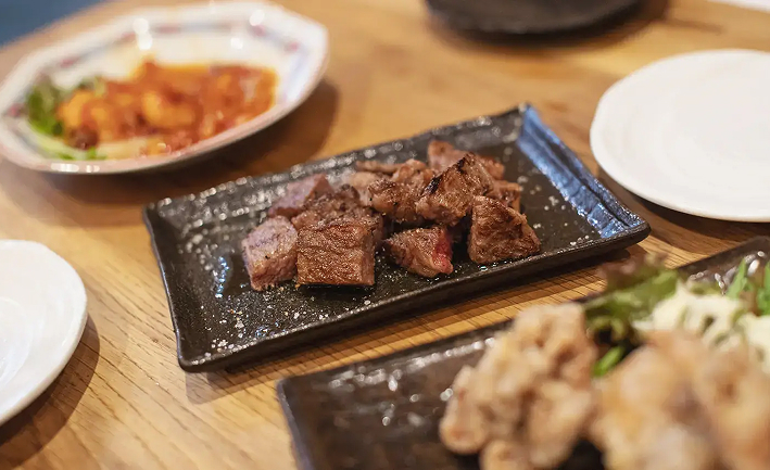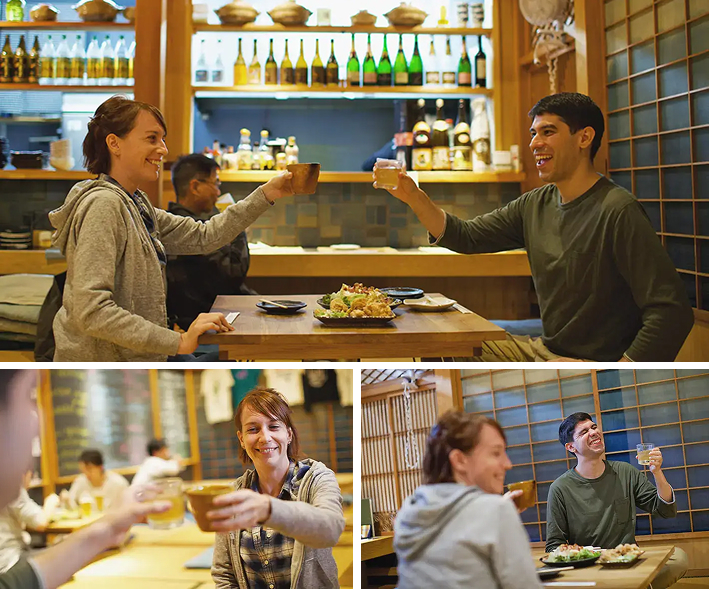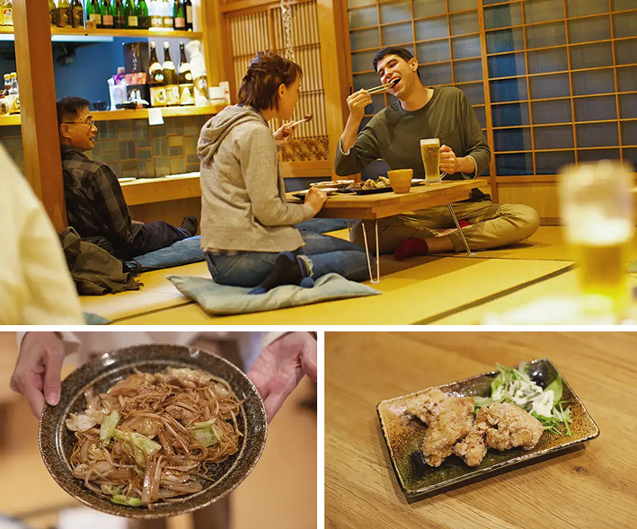 地元の食材を使った日本酒や、麺類、唐揚げなどの日本料理が豊富に揃っています。また、伝統的な居酒屋ではあまり見かけないアヒージョなどの国際的な料理も楽しめます。私が試した日本酒はとても爽やかでした。唐揚げや、さまざまな具材が入ったおでんなどの伝統的な日本料理もいただきました。