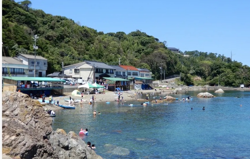 波静かなこの浜は、磯遊びにも楽しいところです。浅瀬近くの岩場には、にな貝などが見られます。