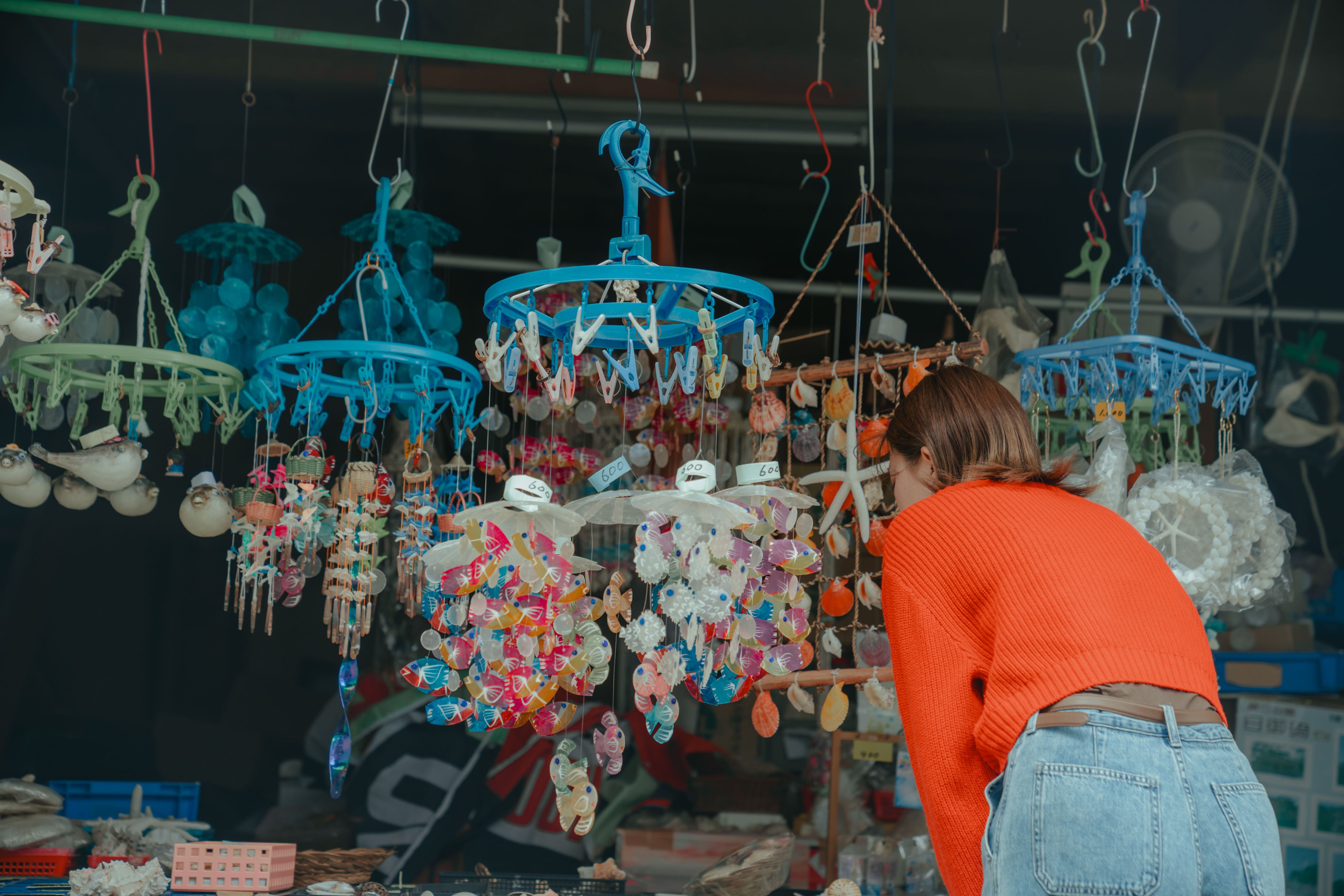 また店頭で焼いてくれる海鮮焼きもオススメ。サザエの壺焼きや肉厚でジューシーなイカ焼きなど、町中に香ばしい香りが漂い食欲をそそります。商店では色とりどりの貝殻や灯台キーホルダーも販売されており、観光客でにぎわっています。